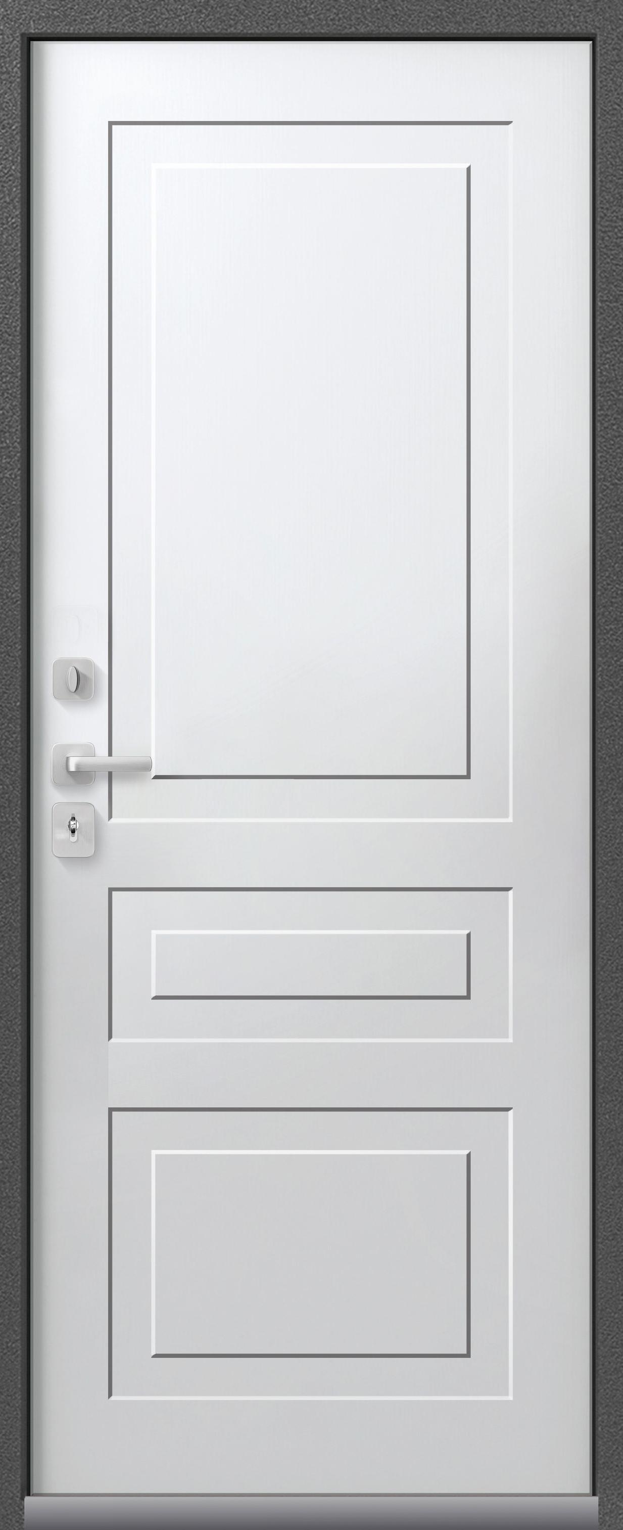 В модели Т-9 внешняя часть – декоративная панель МДФ, в цвете Серый камень, имитирующая бетон. Внутренняя панель с фрезеровкой в современной классике. На выбор 2 цвета – Кашемир белый (универсальный для любого интерьера) и Эверест – брутальный рисунок с имитацией камня.
