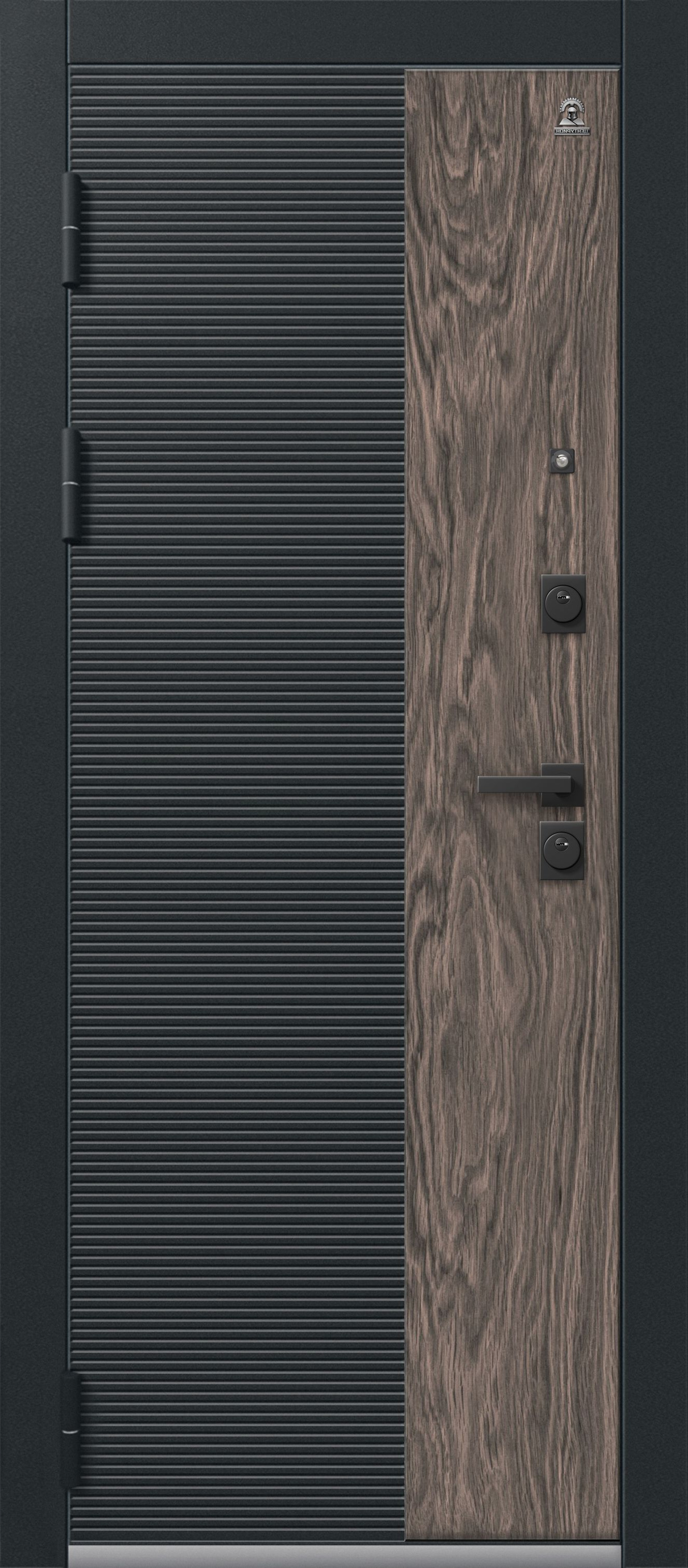 Данная модель имеет внешнюю дизайнерскую панель – сочетание черного цвета и имитации породы дерева. Это позволяет двери С-112 выглядеть стильно не только внутри, но и снаружи. Внутренняя панель в цветах белый или базальт. Дверь выглядит стильно, современно и дорого.В качестве наполнителя мы выбрали пенополистирол – современный материал, оптимальный по показателям тепло и шумоизоляции.