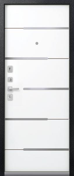 Цилиндровые замки Гардиан – 32.01 (4 класс) и 32.11 (4 класс) надежно защищают помещение, а 3 петли и 2 противосъемных штыря воспрепятствуют вскрытию.Особенностью этой модели являются вставки из нержавеющей стали на внутренней панели, в сочетании с пленкой в цветах белый и базальт. В этой модели сочетаются современные материалы, в актуальных цветах, при этом удобные в уходе и эксплуатации.